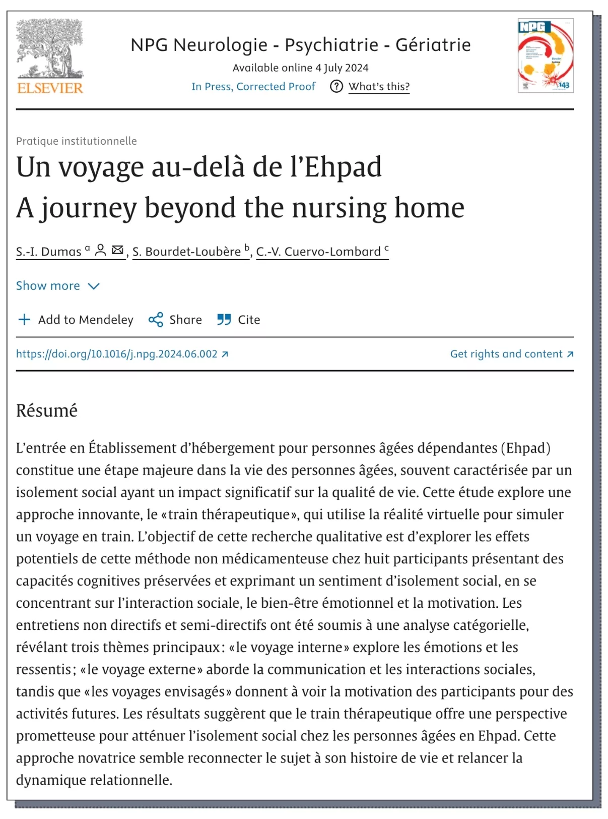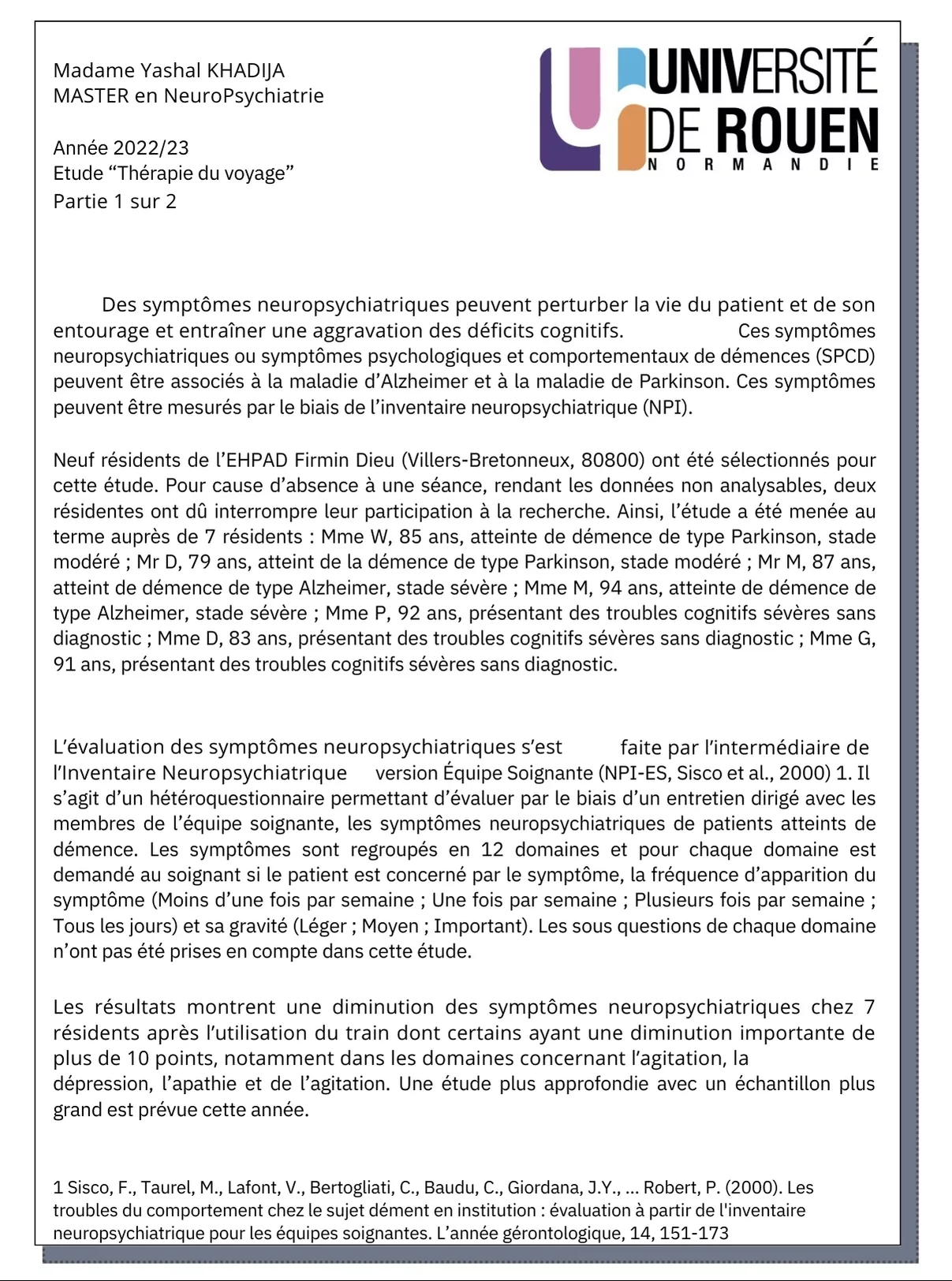 La Thérapie du voyage, sujet de mémoire de Master en NeuroPsychiatrie